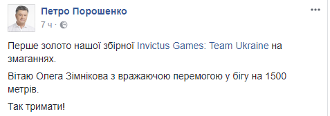 Сразу двое украинских участников "Игр непокоренных" (Invictus Games) принесли медали своей команде. Олег Зимников завоевал золото в беге на 1500 метров, а Александр Ткаченко серебро в беге на 400 метров. Об этом сообщается на Facebook-странице президента Петра Порошенко.