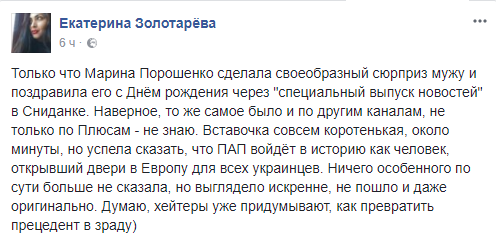Екатерина Золотарева, блогер: "Только что Марина Порошенко сделала своеобразный сюрприз мужу и поздравила его с Днём рождения через "специальный выпуск новостей" в Сниданке. Наверное, то же самое было и по другим каналам, не только по Плюсам - не знаю. Вставочка совсем коротенькая, около минуты, но успела сказать, что ПАП войдёт в историю как человек, открывший двери в Европу для всех украинцев. Ничего особенного по сути больше не сказала, но выглядело искренне, не пошло и даже оригинально. Думаю, хейтеры уже придумывают, как превратить прецедент в зраду)"