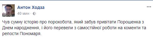 "Слышал печальную историю о порохоботе, который забыл поздравить Порошенко с Днем рождения, и его перевели из самостоятельной работы на комменты и репосты Пономаря", - шутит об ажиотаже с поздравлениями президента блогер Антон Ходза (Олег Пономарь - блогер, известный своими постами в защиту Порошенко).