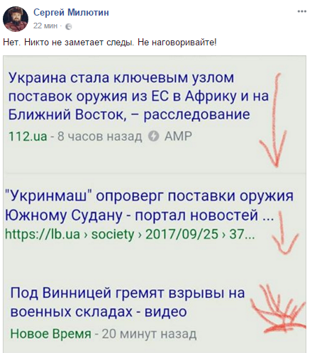 Другой пользователь соцсетей Серегй Милютин  обратил внимание, что взрывы последовали почти сразу после громких скандалов по поводу поставок оружия из Украины в Африку и на Ближний Восток.