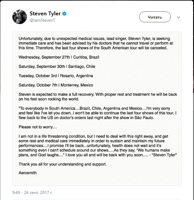 "К сожалению, из-за неожиданных проблем медицинского характера фронтмен Стивен Тайлер, требует неотложного лечения, и медики посоветовали ему не путешествовать и не выступать в этот период", - говорится в ней.