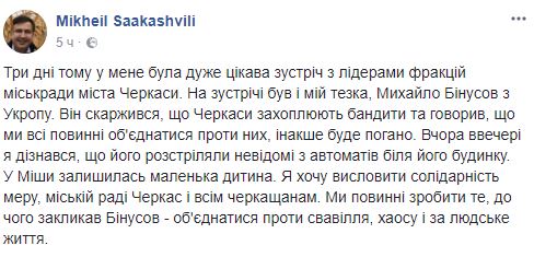 За три дня до убийства Бинусов и ряд других депутатов горсовета встречались с Михаилом Саакашвили. Напомним, что экс-губернатор Одесской области сегодня активно ездит по регионам и вербует себе сторонников. А Черкассы он пообещал сделать своим "штабом". Хотя пока Михо живет в Киеве, в чем признался вчера