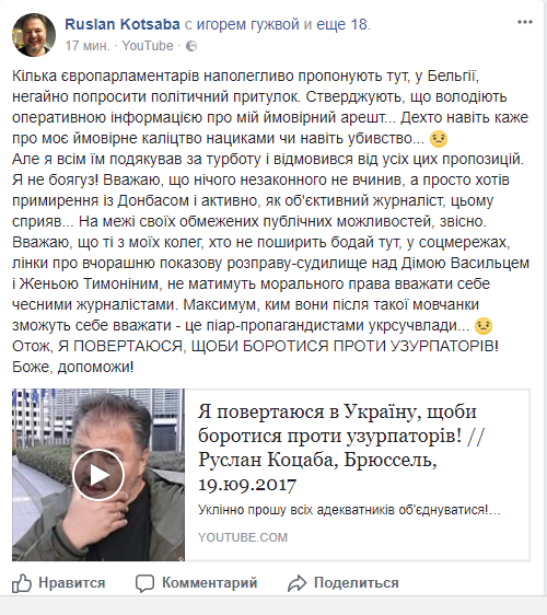 "Несколько европарламентариев настойчиво предлагают здесь, в Бельгии, немедленно попросить политическое убежище. Утверждают, что владеют оперативной информацией о моем вероятном аресте ... Некоторые даже говорят о моем возможном увечье нациками или даже убийстве ... :( Но я всех их поблагодарил за заботу и отказался от всех этих предложений. Я не трус! Считаю, что ничего незаконного не сделал, а просто хотел примирения с Донбассом и активно, как объективный журналист, этому способствовал ... На грани своих ограниченных публичных возможностей, конечно", - пишет Коцаба.