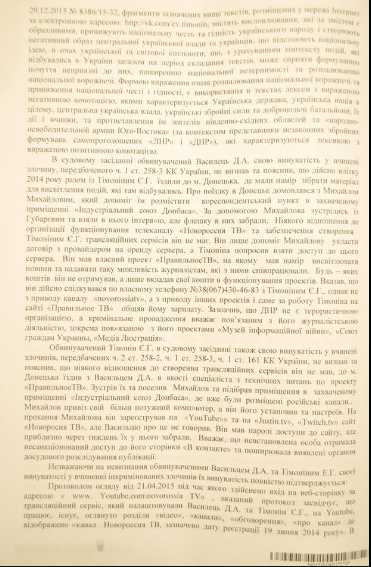Адвокат Светлана Максимец обнародовала приговор Андрушовского суда по делу журналиста Дмитрия Васильца и оператора Евгения Тимонина. Фото документа она разместила в Facebook.
