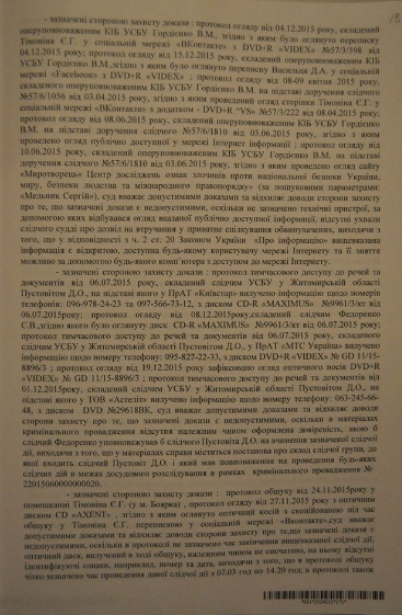 Она упоямнула, что телефоны Васильца и Тимонина прослушивали в июне - августе 2014 года. Аудиозаписи, расшифровки приобщили к делу как доказательства. А само уголовное дело было зарегистрировано 04 апреля 2015 года. При этом Закон "Об оперативно-розыскной деятельности" предусматривает, что прослушка возможна только по постановлению следственного судьи в рамках уголовного производства.