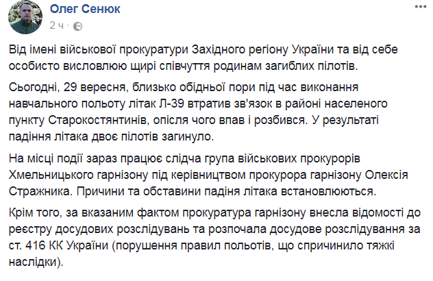 Падение военного самолета в Хмельницкой области квалифицировано как "нарушение правил полетов, которое привело к тяжелым последствиям". Об этом на Facebook в пятницу, 29 сентября сообщил военный прокурор сил АТО Олег Сенюк.