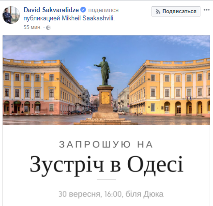 Сегодня, 30 сентября, лидер "Руха новых сил" Михаил Саакашвили зовет жителей Одессы на открытую встречу у памятника Дюку. Об этом он сообщил на свой странице в Facebook.