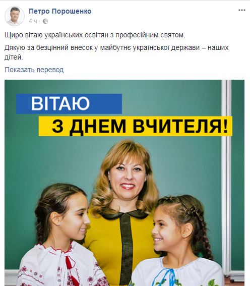 "Искренне поздравляю украинских педагогов с профессиональным праздником. Спасибо за бесценный вклад в будущее украинского государства - наших детей", - написал он на своей странице в Facebook.