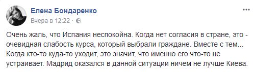 Елена Бондаренко, экс-депутат: "Очень жаль, что Испания неспокойна. Когда нет согласия в стране, это - очевидная слабость курса, который выбрали граждане. Вместе с тем... Когда кто-то куда-то уходит, это значит, что именно его что-то не устраивает. Мадрид оказался в данной ситуации ничем не лучше Киева".