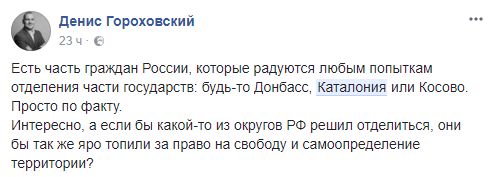 Денис Гороховский, политический эксперт: "Есть часть граждан России, которые радуются любым попыткам отделения части государств: будь-то Донбасс, Каталония или Косово. Просто по факту. Интересно, а если бы какой-то из округов РФ решил отделиться, они бы так же яро топили за право на свободу и самоопределение территории?"
