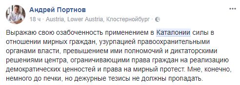 Андрей Портнов, экс-глава АП: "Выражаю свою озабоченность применением в Каталонии силы в отношении мирных граждан, узурпацией правоохранительными органами власти, превышением ими полномочий и диктаторскими решениями центра, ограничивающими права граждан на реализацию демократических ценностей и права на мирный протест. Мне, конечно, немного до печки, но дежурные тезисы не должны пропадать".