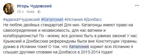 Игорь Чудовский, адвокат: "Не люблю двойных стандартов! Для них- Каталонцы имеют право на самоопределение и независимость, для нас-ватники и колаборционисты! По - моему, все должно быть в рамках закона! У нас Крымский и Донбасские референдумы были вне Конституции Украины, думаю в Испании тоже! О том, что Каталония кормит всю Испанию, я слышал другими словами на Донбассе в 2013-2014 годах!"