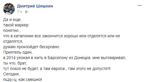 Дмитрий Шишкин, донецкий журналист и медиаменеджер: "Да и еще, такой маркер: понятно, что в Каталонии все закончится хорошо, или отделятся или не отделятся, думаю, произойдет бескровно. Приятель один, в 2014 уезжая в жить в Барселону из Донецка, мне выговаривал: ты что, брат, тут покоя не будет, а там Европа, там этого не допустят! Сегодня п***ц как смешно!"