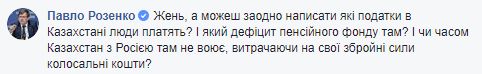 В дискуссию под этим постом вступил сам Павел Розенко. " Жень, а можешь заодно написать налоги в Казахстане люди платят? И какой дефицит пенсионного фонда там? И часом Казахстан с Россией там не воюет ли, тратя на свои вооруженные силы колоссальные средства?" – спросил он.