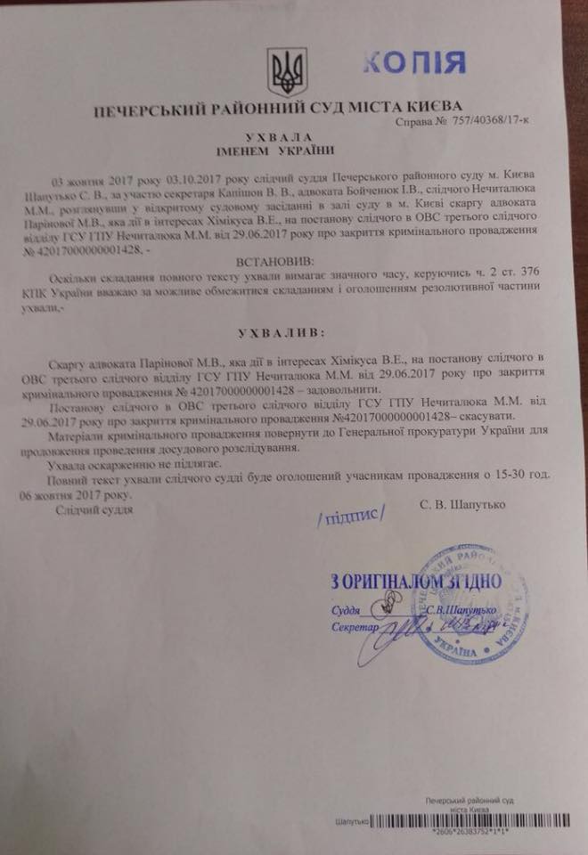 Печерский районный суд отменил постановление Генеральной прокуратуры о закрытии уголовного производства в отношении следователя прокуратуры, который закрыл дело о стрельбе народного депутата Сергея Пашинского в прохожего Вячеслава Химикуса. Об этом сообщает адвокат пострадавшего Марина Паринова на странице в Facebook.