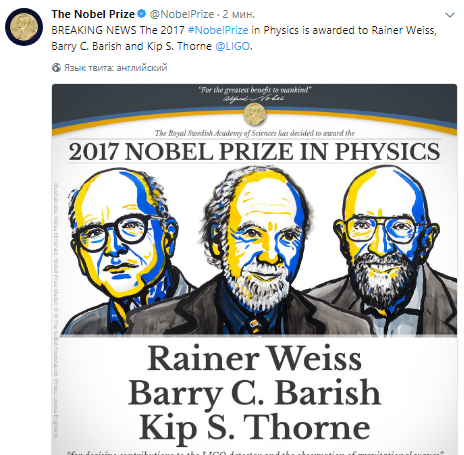 Лауреатами стали Райнер Вайсс (половина премии), Кип Торн и Барри Бэриш с формулировкой "за решающий вклад в детектор LIGO и за наблюдение гравитационных волн". Официальное вручение премий и медалей состоится в декабре, после прочтения традиционных лекций.