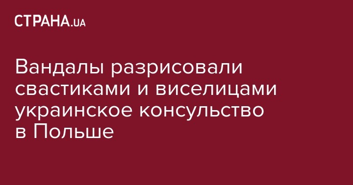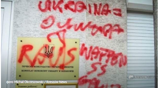 На здании консульства неизвестные вандалы написали на польском языке: "Украина = ОУН-УПА", "Waffen SS Galitzien", у герба Украины нарисовали виселицу и надпись Raus (на немецком языке "долой"), свастику и надпись на русском "имеется".