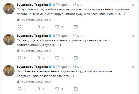 "Украинцы способны сформировать антикоррупционные органы включая Антикоррупционный суд. В Верховном суде в ближайшее время должна быть создана Антикоррупционная палата не как замена Антикоррупционного суда, а как кассационная инстанция", - цитирует Цеголко.