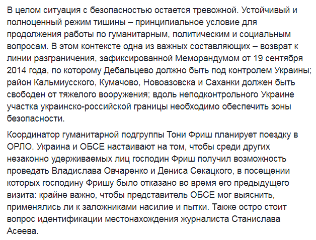 "В этом контексте одна из важных составляющих – возврат к линии разграничения, зафиксированной Меморандумом от 19 сентября 2014 года, по которому Дебальцево должно быть под контролем Украины; район Кальмиусского, Кумачово, Новоазовска и Саханки должен быть свободен от тяжелого вооружения; вдоль неподконтрольного Украине участка украинско-российской границы необходимо обеспечить зоны безопасности", - написала Олифер.