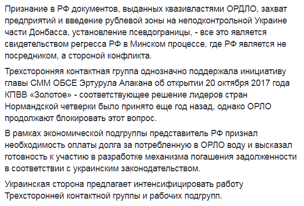 Также, по ее словам, в рамках экономической подгруппы представитель РФ признал необходимость оплаты долга за потребленную в ОРДЛО воду и "высказал готовность к участию в разработке механизма погашения задолженности в соответствии с украинским законодательством".