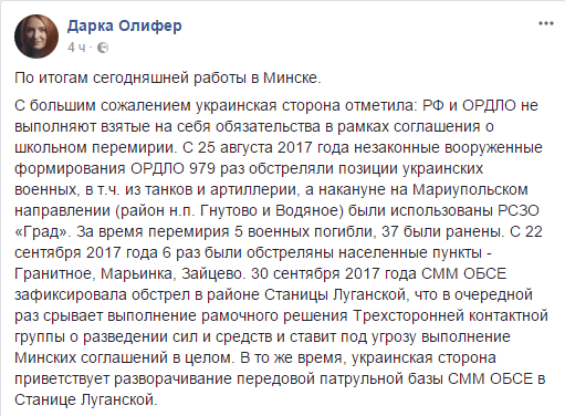 "С большим сожалением украинская сторона отметила: РФ и ОРДЛО не выполняют взятые на себя обязательства в рамках соглашения о школьном перемирии. С 25 августа 2017 года незаконные вооруженные формирования ОРДЛО 979 раз обстреляли позиции украинских военных, в том числе из танков и артиллерии, а накануне на Мариупольском направлении (район населенных пунктов Гнутово и Водяное) были использованы реактивные системы залпового огня "Град". За время перемирия 5 военных погибли, 37 были ранены", - проинформировала Олифер.
