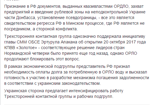 Украинские представители в ТКГ также считают, что "признание в РФ документов, выданных квазивластями ОРДЛО, захват предприятий и введение рублевой зоны на неподконтрольной Украине части Донбасса, установление псевдограницы, - все это является свидетельством регресса РФ в Минском процессе, где РФ является не посредником, а стороной конфликта", - отметила она.