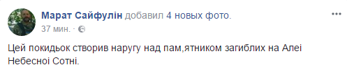 Сегодня, 5 октября, в Киеве на Аллее Небесной сотни неизвестный человек разрушил мемориал, посвященный  погибшим героям Майдана. Это случилось около полудня, написал пользователь Виталий Черный и приложил фото разоренного мемориала.