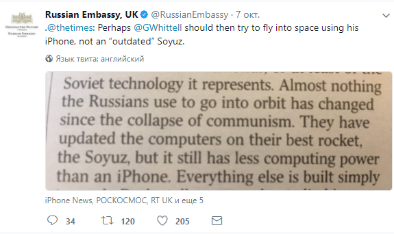 В последствии утверждение Уиттелла о том, что у ракеты-носителя "Союз" "мощность компьютерных систем меньше, чем у iPhone" прокомментировали в посольстве России в Великобритании.