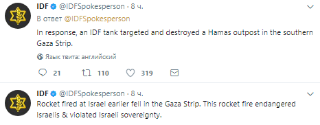 В ответ израильский танк разрушил опорный пункт группировки "Хамас" на юге сектора Газа. Именно на нее возлагает ответственность Израиль.