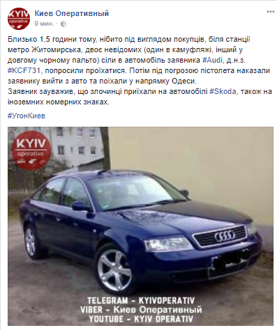 Сегодня, 9 октября, около 15.30 двое мужчин под видом покупателей, угнали автомобиль возле станции метро Житомирская. Об этом сообщает "Киев Оперативный" в Facebook.