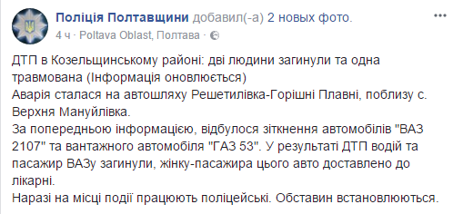 "Произошло столкновение автомобилей ВАЗ 2107 и грузового автомобиля ГАЗ 53. В результате ДТП 29-летний водитель и 59-летний пассажир ВАЗа погибли, 52-летнюю женщину-пассажира этого авто доставили в больницу", – сообщается в Facebook полиции.