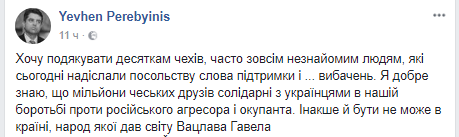 "Хочу поблагодарить десятки чехов, часто совершенно незнакомых людей, которые сегодня направили посольству слова поддержки и... извинений", – написал посол в Facebook.