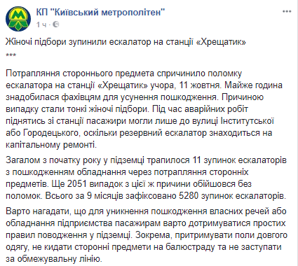 В среду, 11 октября, эскалатора на станции "Крещатик" в Киеве остановился из-за женских каблуков, которые нарушили его работу. На устранение поломки ушел почти час. Все это время пассажиры могли подняться на поверхность только о улицы Институтской или Городецкого, поскольку резервный эскалатор находится на капитальном ремонте.