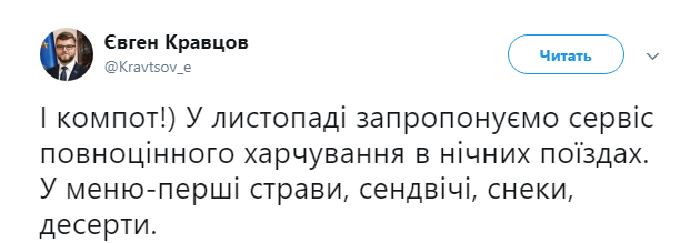 "Укрзализныця" планирует с ноября запустить сервис полноценного питания для пассажиров в ночных поездах. Об этом в Twitter сообщил и.о. председателя правления компании Евгений Кравцов.