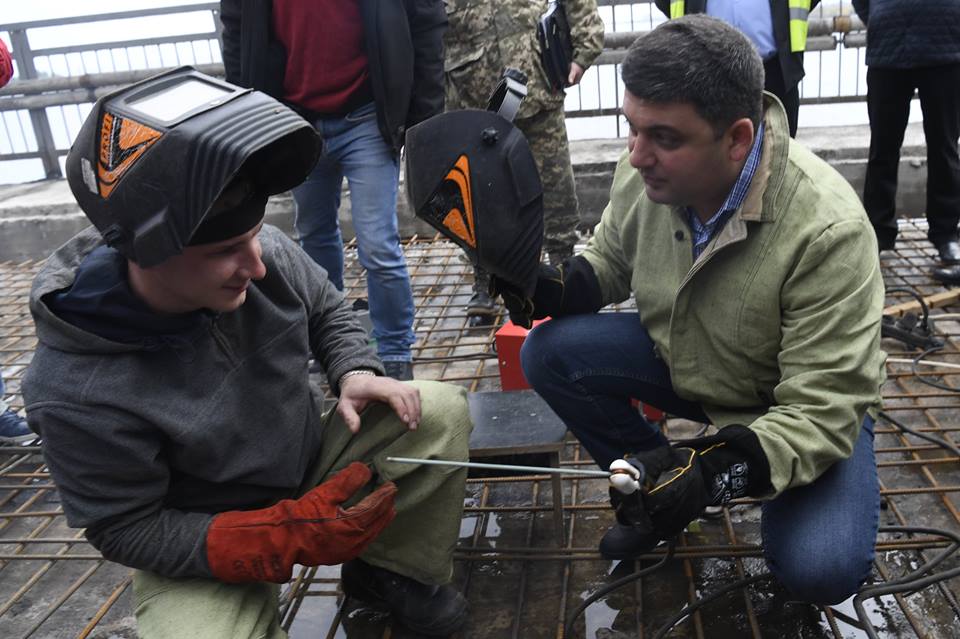 "В новом мосту будет и частица моего труда – вспомнил юношеский заводской опыт и один из швов мостовой конструкции сварил сам – под пристальным наблюдением, конечно". Однако не обошлось и без курьезов - в то время, как Гройсман решил помочь сварщику, у него "залип" электрод.