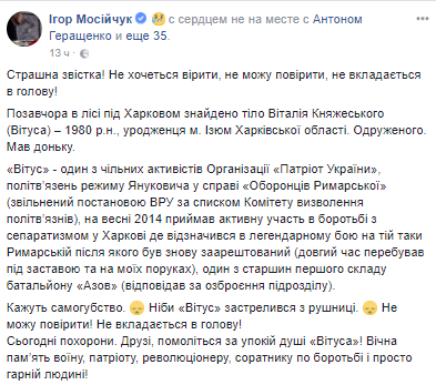 "Говорят самоубийство. Вроде" Витус "застрелился из ружья. Не могу поверить! Не укладывается в голову! Сегодня похороны. Друзья, помолитесь за упокой души "Витуса"! Вечная память воину, патриоту, революционеру, соратнику по борьбе и просто хорошей человеку!" - подчеркнул политик.