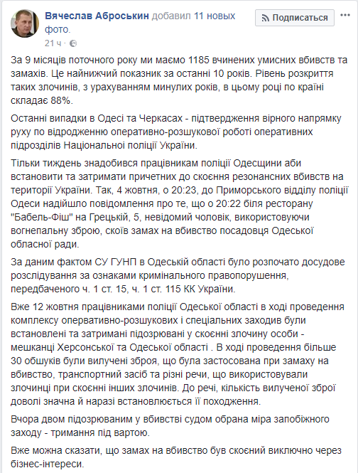 В полиции заявили, что покушение на заместителя главы Одесского облсовета Олега Радковского связано исключительно с его бизнес-интересами. Об этом сообщил в Facebook первый замглавы Нацполиции Вячеслав Аброськин.
