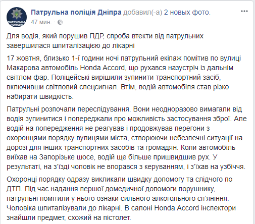 В Днепре пьяный водитель пытался на высокой скорости скрыться от преследования патрульных, но в итоге вылетел в кювет и получил повреждения. Об этом сообщает патрульная полиция Днепра в Facebook.