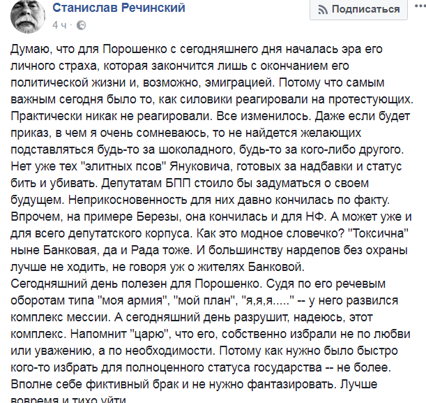 "Сегодняшний день полезен для Порошенко. Судя по его речевым оборотам типа "моя армия", "мой план", "я,я,я....." -- у него развился комплекс мессии. А сегодняшний день разрушит, надеюсь, этот комплекс. Напомнит "царю", что его, собственно избрали не по любви или уважению, а по необходимости. Потому как нужно было быстро кого-то избрать для полноценного статуса государства -- не более. Вполне себе фиктивный брак и не нужно фантазировать. Лучше вовремя и тихо уйти", - отметил Речинский.