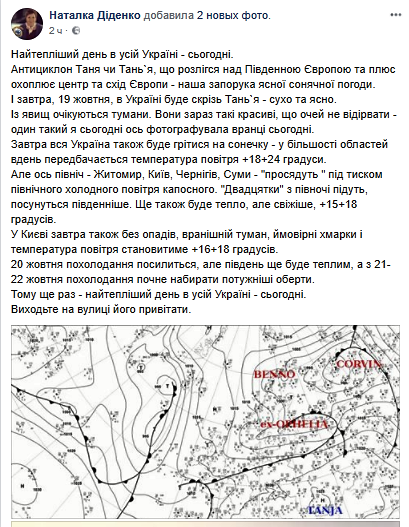 "Антициклон Таня, который раздался над Южной Европой и охватывает центр и восток Европы - наш залог ясной солнечной погоды. Теплый день по всей Украине - сегодня", - написала Диденко.