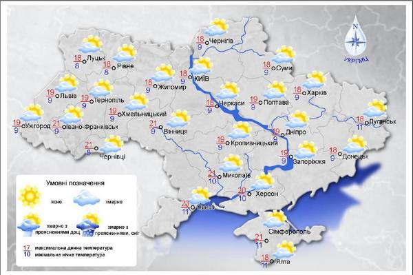 В целом по Украине 19 октября ожидается погода без осадков, возможен туман, ветер юго-западный, 5-10 м/с. Температура ночью 6-11°, днем 15-20°. Теплее будет в Винницкой, Николаевской областях - до 23° тепла. В Одесской области - до 25° тепла.