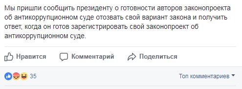 "Глава государства пытается снять с себя ответственность и не публично, через разных представителей предлагает парламенту создать рабочую группу, которая как подсказывает опыт, затянет принятие решения на неопределённое время, - написал Мустафа Найем. - Мы пришли сообщить президенту о готовности авторов законопроекта об антикоррупционном суде отозвать свой вариант закона и получить ответ, когда он готов зарегистрировать свой законопроект об антикоррупционном суде".