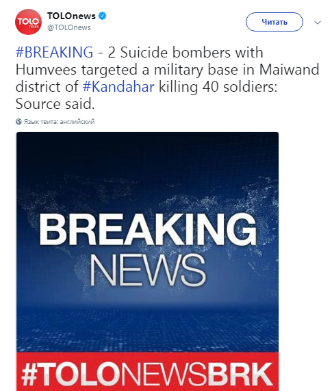"Два террориста-смертника атаковали на Humvee военную базу в районе Мейванд в провинции Кандагар, убив 40 солдат", - говорится в сообщении.