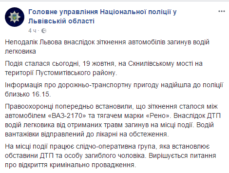 "ДТП произошло сегодня, 19 октября, на Скниловском мосте на территории Пустомытовского района. Правоохранители предварительно установили, что столкновение произошло между автомобилем ВАЗ-2170 и тягачом марки Renault. В результате ДТП водитель легковушки от полученных травм погиб на месте происшествия. Водитель грузовика отправлен в больницу на обследование", - сообщили в полиции.