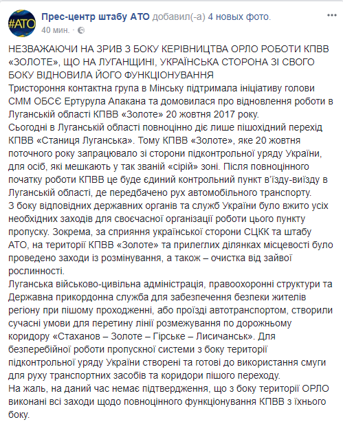 "КПВВ "Золотое" 20 октября текущего года заработало со стороны, подконтрольной правительству Украины, для лиц, проживающих в так называемой "серой" зоне. После полноценного начала работы КПВВ это будет единственный контрольный пункт въезда-выезда в Луганской обл., где предусмотрено движение автомобильного транспорта", - говорится в сообщении.