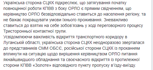"К сожалению, в настоящее время нет подтверждения, что со стороны территории ОРЛО выполнены все мероприятия по полноценного функционирования КПВВ с их стороны. Украинская сторона СЦКК подчеркивает, что затягивание начала полноценной работы КПВВ со стороны ОРЛО является прямым свидетельством того, что руководство ОРЛО безответственно относится к населению региона, и не желает улучшать условия их проживания. Пренебрежительно относится к взятых на себя обязательств в ходе переговорного процесса Трехсторонней контактной группы", - говорится в сообщении.