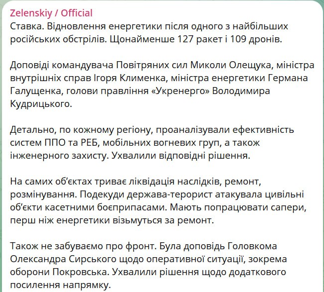 "Был доклад главкома Александра Сырского по поводу оперативной ситуации, в частности, обороны Покровска", – написал президент в своем сообщении о заседании Ставки.