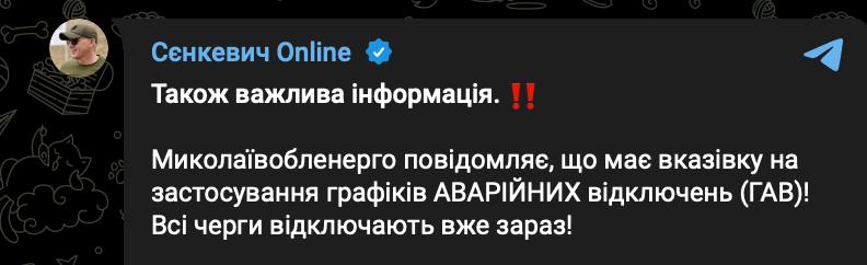 8.56 В Николаевской области вводятся аварийные отключения света, сообщил мэр Николаева.
