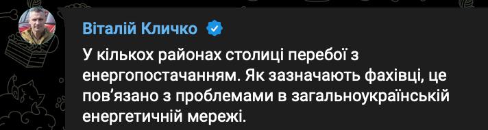 9.07 По словам Кличко, отключения света в Киеве идут на правом берегу.