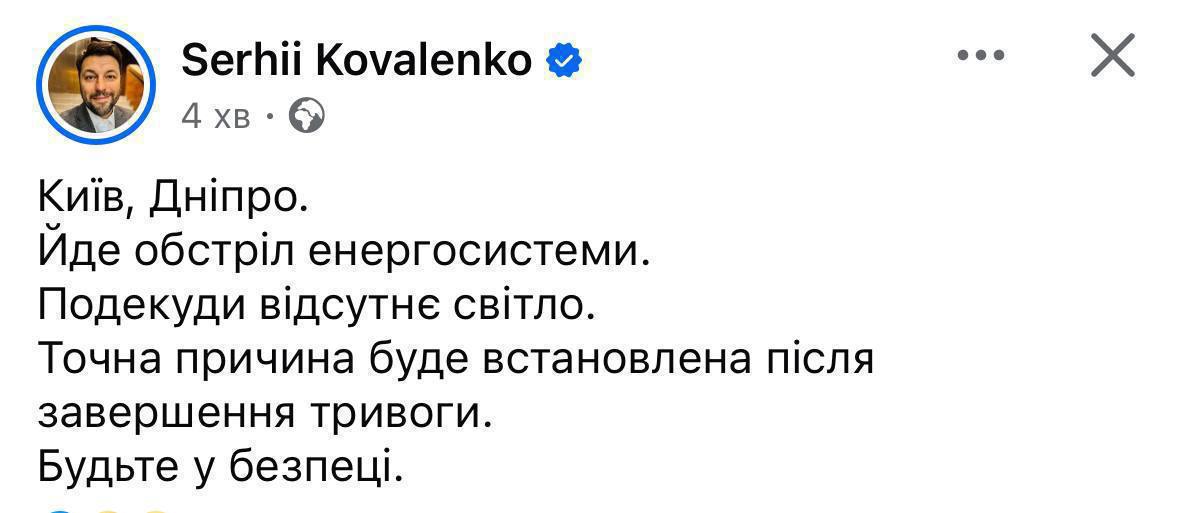 21.59 В Киеве завтра 50-70% потребителей останутся одновременно без света, сообщил гендиректор Yasno Коваленко.